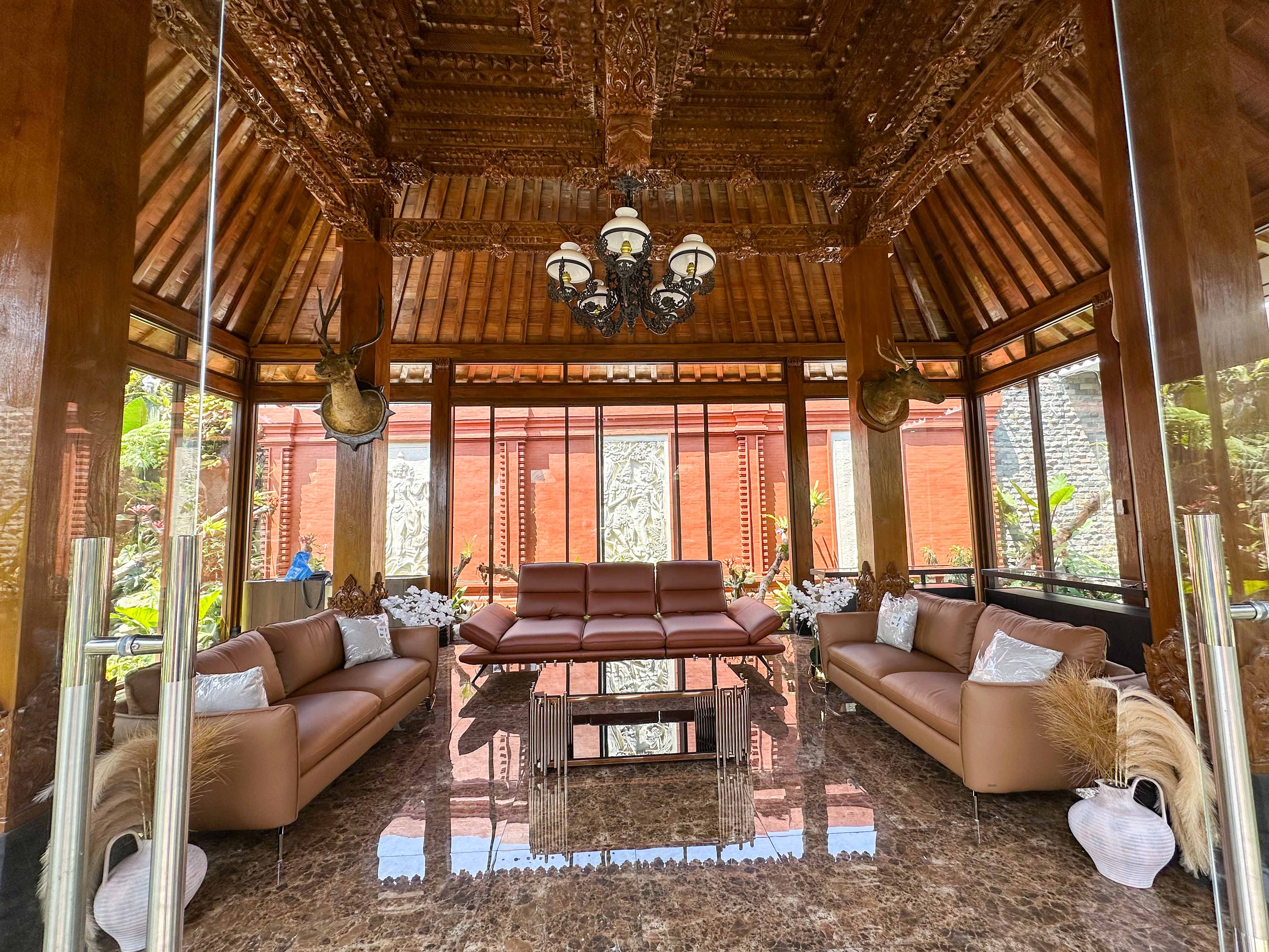 Pendopo megah dengan full ukiran jati halus dan mendetail pada tiang, balok, dan plafon—menampilkan kemewahan dan keindahan budaya Jawa dalam satu kesatuan estetika. Dikerjakan oleh pengrajin ukir profesional dari daerah pusat ukiran terbaik di Jawa Timur.